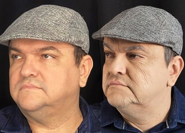 a habilidade da técnica de ENVELHECIMENTO realista para transformar personagens no cinema, teatro e produções audiovisuais.